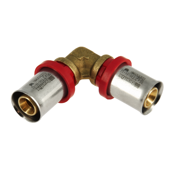De Bonfix Alu-pers kniekoppeling 16 x 16 mm is een messing persfitting (90° bocht) voor het verbinden van meerlagenbuizen (Alu-PEX) met een buitendiameter van 16 mm. Deze persknie wordt gebruikt om leidingen onder een rechte hoek te verbinden, zonder dat de buis gebogen hoeft te worden.
