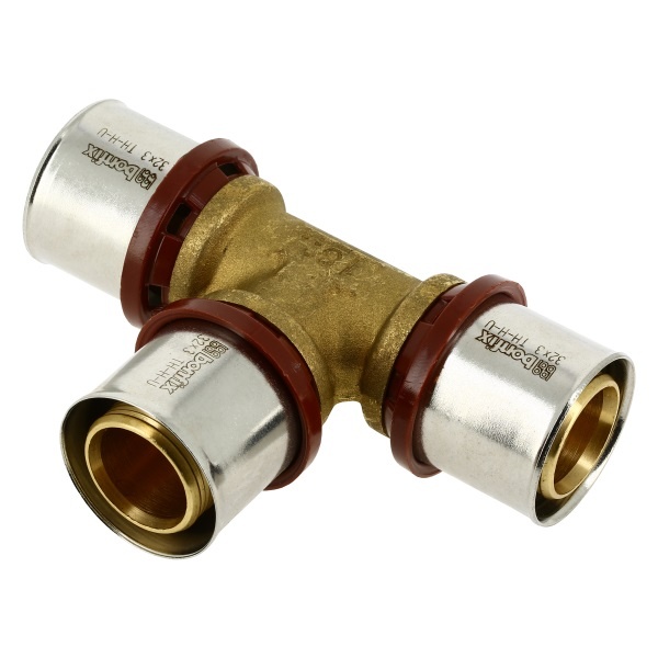 Deze T-koppeling is uitgevoerd als messing persfitting met RVS pershuls en EPDM afdichting. Die combinatie zorgt voor een sterke, duurzame en betrouwbare verbinding in installaties voor water, verwarming en koeling. De T-vorm maakt de fitting extra geschikt voor het verdelen van leidingwerk, het creëren van vaste aftakkingen en het logisch opbouwen van een compleet meerlagenbuissysteem met meerdere aansluitpunten. Bij de 32 mm variant is die stevige opbouw ook belangrijk omdat deze maat veel wordt toegepast in grotere installaties waar een stabiele, lekvrije en onderhoudsarme verdeling noodzakelijk is.