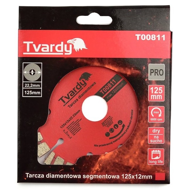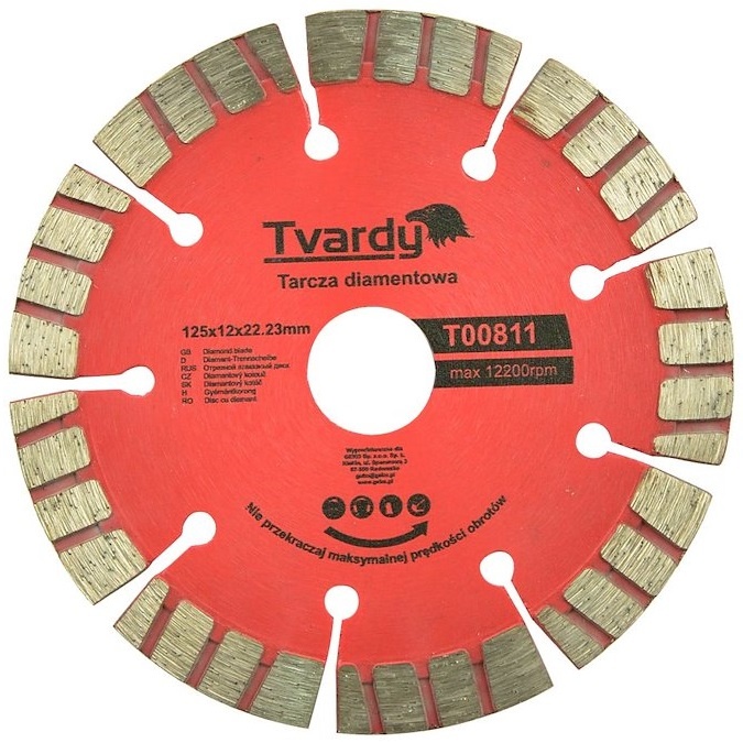 Premium klasse Tvardy diamantschijf, ontworpen voor het zagen van harde bouwmaterialen zoals: beton, gewapend beton, tegels, klinkers, baksteen, steen, silikaat, cementdekvloer, pleisterwerk, gasbeton. De schijf heeft segmenten met een 12 mm laser-gesoldeerde korrel met een hoge concentratie diamant. Dit zorgt voor snel en effectief zagen van bouwmaterialen en verlengt de levensduur van de schijf aanzienlijk.