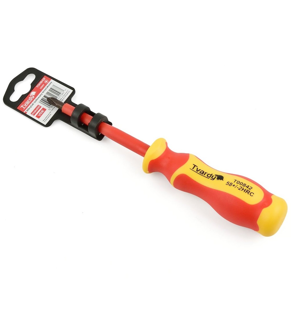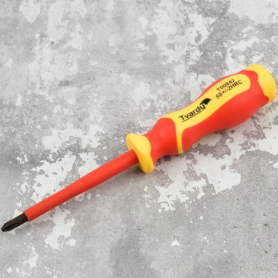 Professionele geïsoleerde VDE kruiskopschroevendraaier PH2, ontworpen voor elektriciens. De ergonomische, meercomponenten handgreep biedt effectieve isolatie tot 1000V. Ideaal voor allerlei werkzaamheden aan laagspanningsinstallaties. De punt van de schroevendraaier is gemaakt van hoogwaardig S2-staal, dat thermisch is behandeld voor optimale prestaties; de hardheid van de punt ligt tussen 56–60 HRC. De schacht van de schroevendraaier is gemaakt van CRV-staal, dat zich kenmerkt door een hogere elasticiteit.